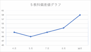 下のグラフは中3のある生徒の成績です。このお子さんは「難しい、難しい」と言いながら必死に勉強するお子さんです。